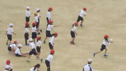 2年生の子どもたちの元気な声が聞こえてきました。体育の授業でボールをバトンがわりにしてリレー遊びをしていました。