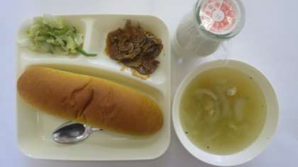 今日の給食のメニューは、豚肉のデミグラスソース、スープ、キャベツとピーマンのソテー、牛乳、パン、でした。豚肉のデミグラスソースは特製手づくりの濃厚なデミグラスソースがこんがりパリッと焼き目がつくように焼かれた豚肉を包み込んでいて、洋風感が味わえました。スープは鶏肉の旨みがとけ出し、たまねぎもトロトロになるまで煮られていて深みのある味に仕上がっていました。キャベツとピーマンのソテーは塩コショウがピリッとアクセントになっていました。