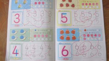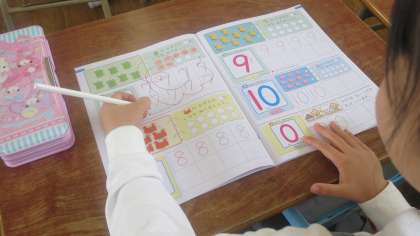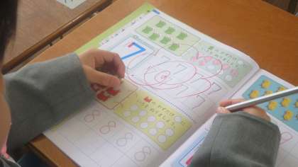1年生が数字を書く学習をしていました。1から7まで進んでいます。えんぴつをしっかりともって練習ノートに書いていきます。子どもたちは真新しいえんぴつやけしゴムをそろえてもらって、とてもうれしそうにしています。一文字ずつ時間をかけてゆっくりとていねいに書くようにしていました。先生が「じょうずにかけているね」とはなまるをしてくれます。みんなとても喜んでいました。