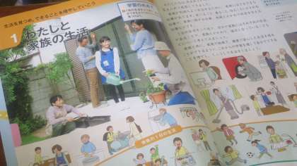 5年生から家庭科の授業が始まります。家庭科ってどんな授業かな。今日は「家族の生活」について考えていました。家族が気持ちよく生活するために、家族にはさまざまな仕事があります。食べること、着ること、住むこと、その他にもたくさん・・・、先生がたずねます。何か家で自分の仕事や役割がありますか…。