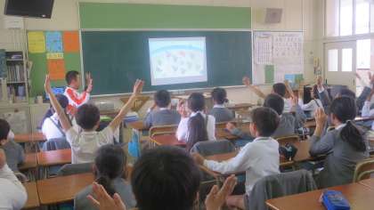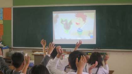 今年度もモジュールタイムを実施しています。毎日、午後の授業が始まる前の10分間、基礎学力の定着を図ったり英語学習に取り組んだりします。今日は英語で「E−time」と呼んでいます。英語で歌ったりジェスチャ−をしたり…、英語に慣れ親しむ活動を工夫して実施しています。シェ−ン先生がきたときにはテレビ放送で絵本の読み聞かせなども行っています。
