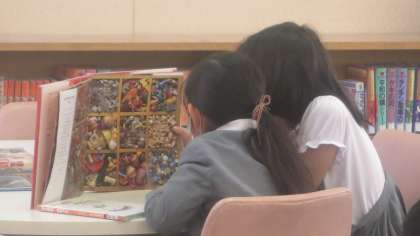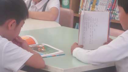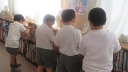 図書室を2年生が利用していました。何の本を読もうかな?…たくさんの本の中から自分が読みたい本をさがしています。本を見つけたら席について静かに読んでいました。おしゃべりする子はほとんどいません。聞こえても本当に小さな声です。まわりのことも気にすることができます。一人で読んでいる子、友だちと一緒に読んでいる子…、いろんな形で読書に慣れ親しんでいました。いいことですね。
