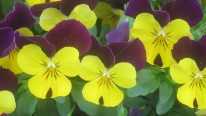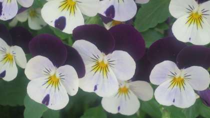 パンジーとビオラは同じ種類のお花で、花の大きさの違いで区別されています。花びらや葉っぱの大きな花はパンジーで、小さな花はビオラだそうです。この写真はどっちかな。見た目はほとんど同じみたいです。パンジーは、花色が豊富で花だんやガーデニングに人気のある一年草です。とてもいろあざやかですね。