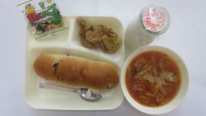 今日の給食のメニューは、一口トンカツ、ミネストローネ、豆こんぶ、牛乳、パン、でした。一口トンカツはころもはサクッと食感よく上手に揚げられていて、豚肉にもしっかりと下味がついていてやわらかく食べやすかったです。ミネストローネはにんにくの香りとトマトの酸味がほどよく効いており、野菜も細かく刻まれていて飲みやすく、あっさりとした仕上がりとなっていました。豆こんぶはこんぶの方に人気があるみたいです。