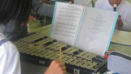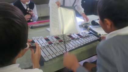 6年生が音楽室で楽しく楽器演奏です。先生の指導をよく聞きながら鉄琴とリコーダーを演奏していました。「星空はいつも」という曲を演奏するのですが、鉄琴は順番に全員がチャレンジしていました。グループで協力して全員が演奏できるようにがんばっています。教え合っている姿がとても微笑ましかったです。その後には、大きな声で「つばさをください」を合唱していました。