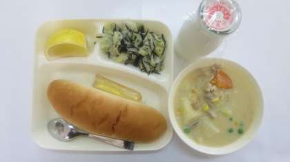 今日の給食のメニューは、コーンクリームシチュー、キャベツのひじきドレッシング、河内ばんかん、はちみつ、牛乳、パン、でした。コーンクリームシチューは濃厚でクリーミーな手づくりのルウが香り豊かで、鶏肉やホクホクのじゃがいもをやさしく包み込んでいました。コーンの甘さが溶け出し、マッシュルームが食感にアクセントを与えていました。キャベツのひじきドレッシングは薄めに味付けされたひじきドレッシングがキャベツにからんでおいしかったです。河内ばんかんはあまり甘くなくさっぱりとしていました。