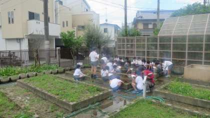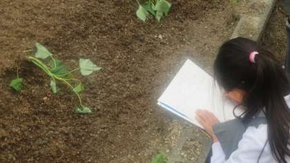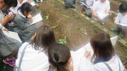 2年生が生活科の学習でさつまいものなえを植えました。きょうはかんさつです。「あれー、なんかぺちゃんてなってる。」「かれてるのかなあ。」「げんきがないみたい。」「せんせいー だいじょうぶなんこれ」…、さつまいものなえを心配する子どもたちの声があちこちから聞こえてきます。「だいじょうぶだよー。」…、先生が笑顔で答えます。「これからしっかりと水や太陽をあびて、どんどん元気に育っていくからね。」