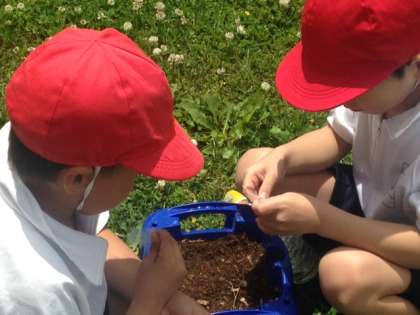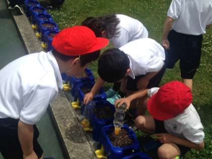 一年生があさがおのたねをうえました。うえきばちに土を入れて、そっと小さなゆびであなをあけます。上手にたねを入れました。大きくなーれ!大きくなーれ!さっそく水をたっぷりあげていました。何色のあさがおが咲くのかな。楽しみだね。