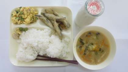 今日の給食のメニューは、きびなごてんぷら、みそ汁、えんどうの卵とじ、牛乳、ごはん、でした。きびなごてんぷらはころもがサクッと揚げられていて、身はやわらかく食べやすかったです。みそ汁は具だくさんでていねいに細かく刻まれた野菜がたくさん入っていました。味付けは濃すぎず薄すぎず、ちょうどよいみその合わせ加減でした。えんどうの卵とじは甘めのだしが卵と鶏肉にからんで、えんどうまめがトッピング的でとてもかわいらしく見えました。