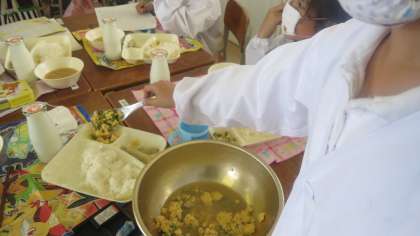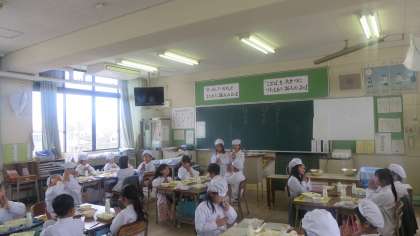 2年生の教室をのぞいてみると、おかわりがほしい子におかずをくばっているやさしいお友だちがいました。