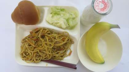 今日の給食のメニューは、カレースパゲッティ、キャベツのサラダ、バナナ、牛乳、パン、でした。カレースパゲッティはからいりしたベーコンとにんにく、カレー粉で風味よく香りづけされた豚挽肉や細かく刻まれた野菜がスパゲッティにほどよくからまり、とてもおいしく仕上がっていました。スパゲッティのゆで加減もちょうどよかったです。キャベツのサラダはさっぱりとしていて口当たりがよかったです。バナナは…、普通だったけどおいしかったです。