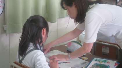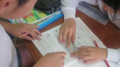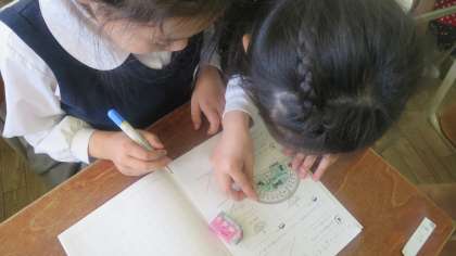 4年生が算数の授業で分度器を使っていました。分度器を使って角度を測ります。しかも180度から360度までの角度です。180度+●度 や 360度−■度 の計算を用います。でもまずはきっちりと分度器を正確に使いこなさなければいけません。子どもたちは分度器がずれないように手でおさえながら、えーとえーと・・・。友だち同士でも確認し合っています。先生も回りながら「だいじょうぶかなー、みんなできてるかなー。」
