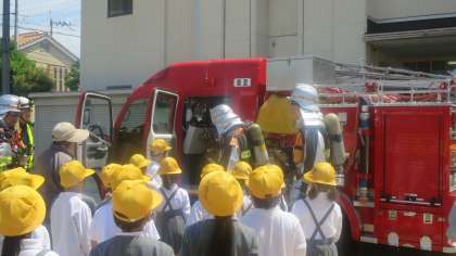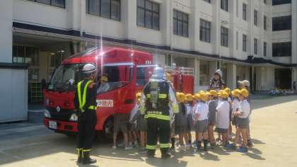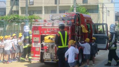 3時間目は、1・2年生は消防車の見学です。子どもたちは興味津々で消防車をのぞき込んでいました。消防隊員の方々がわかりやすく簡単に説明をしてくれました。消防車にも乗せてもらいました。消防隊員の方々が防火服まで着ていただいていたのでリアル感が増し、子どもたちもとても喜んでいました。