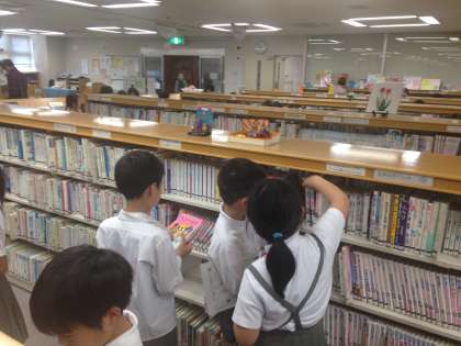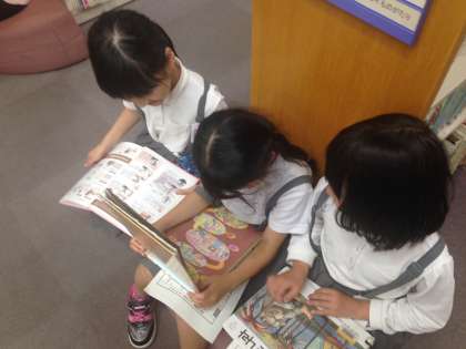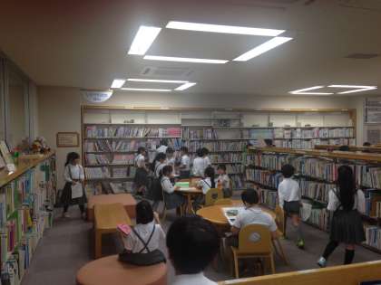 実際に図書館の中を見学しています。学校の図書室と違ってとても広いです。子どもたちは一斉にお目当ての本を探し始めました。本がたくさんありすぎて、みんな迷っています。でも本を見つけると、嬉しそうに座りこんで読んでいました。これを機会にもっともっと本に親しむ子どもたちになってほしいですね。