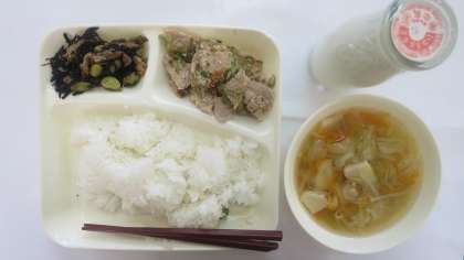 今日の給食のメニューは、豚肉のごまだれ焼き、五目汁、ひじきの炒め煮、牛乳、ごはん、でした。豚肉のごまだれ焼きはごまの風味が効いた和風だれが豚肉やピーマンにからんで、豚肉もこんがり焼き色がついていて、ごはんにとてもよく合っていました。五目汁はだしこんぶとけずりぶしでだしがしっかりととられていて、深い味わいに仕上がっていました。ひじきの炒め煮は薄味でうすあげの甘みがほんのり漂い、ひじきの黒とむき枝豆の緑のコントラストがマッチしていました。