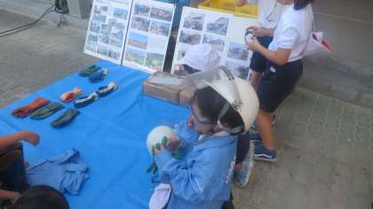 服の試着やヘルメット、防護メガネ、専用手袋なども展示してあり、子どもたちは喜んで身にまとっていました。パッカー車をバックに記念撮影もしました。