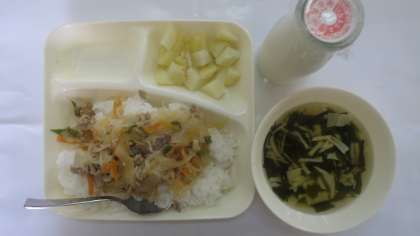 今日の給食のメニューは、豚丼、ゆばのすまし汁、焼きじゃが、牛乳、でした。豚丼は甘めの和風だしが具材にしっかりとしみ込んでいて、ごはんにかけるとさらに味が広がる感じがしました。豚肉の旨みや糸こんにゃくの食感でさらに食欲が増してきました。ゆばのすまし汁はだしがしっかりととられた透明感のある透き通ったスープにゆばとたけのこが漂い、深みのある味に仕上がっていました。焼きじゃがはやわらかく塩がピリッと効いていておいしかったです。