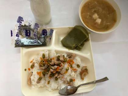 今日の給食の献立は、かやくご飯、みそ汁、抹茶ういろうでした。ノリも付いていて、かやくご飯に振りかけると、とてもおいしかったです。みそ汁も具沢山で、野菜が柔らかくて食べやすく、栄養満点です。抹茶ういろうは優しい甘みがありました。抹茶はお茶の木におおいをかけて育てた葉を蒸し、もまないで作ったてん茶を粉にしたものだそうです。大変手間がかかっているのですね。