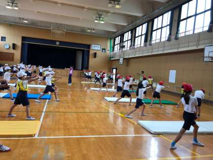 今度は、4時間目4年生が体育館でマット運動をしています。まずはストレッチから音楽に合わせて念入りに行っていました。しっかりと体をほぐして、ケガのないように気をつけています。