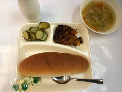 今日の献立は、じゃがいものミートグラタン、スープ、きゅうりのピクルスです。パンにはマーガリンがついています。じゃがいものミートグラタンは、しっかり味付けされていて、じゃがいもも味わい深かったです。きゅうりのピクルスはさっぱりとしていて、ミートグラタンとよく合っていました。スープは野菜が柔らかくて、パセリの香りが効いていました。