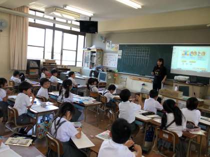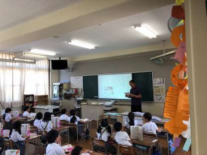 1年生も学習に慣れてきています。1組では算数の授業でしたが、ノートの書き方を先生が丁寧に教えていました。2組では音読の学習で座っている順番に詩を読んでいました。学習の仕方を学んでどんどん成長しています。