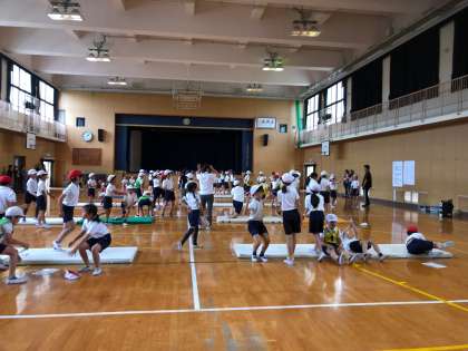 学習参観では5年生は、玉止めなど裁縫の基本から学習しています。保護者の方々にも見ていただくいい機会になるかと思います。体育館では4年生がマット運動の真っ最中です。前転や後転の組み合わせの技を確実にしようという目的で、グループの中で声をかけあって、技を磨いていました