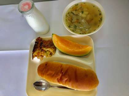 今日の献立は、カレードリア、スープクインシーメロンでした。カレードリアはカレーの香りが高く香ばしく焼き上げられていました。スープはあっさりとした塩味でパセリが彩りよく野菜をたくさん食べることができます。クインシーメロンは甘くて柔らかく、オレンジ色をしています。この中にはカロテンがたくさん含まれているそうです。