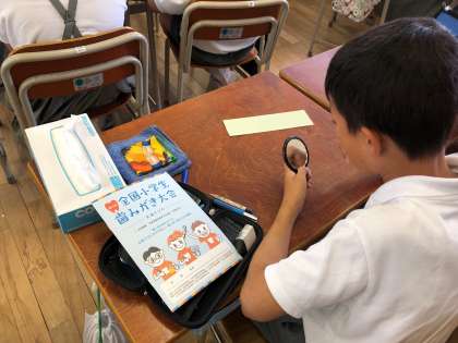 全国小学生歯みがき大会に5年生が参加しました。歯科衛生士さん、歯科校医さん、保健の先生が歯の健康について教えてくださいました。写真は鏡を見ながら、糸ようじの使い方を学習しているところです。その他、歯ぐきの様子を見たリ、歯並びにあった歯ブラシの使い方などを学びました。永久歯がそろってくる5年生のこの時期に、歯を大切にして口の中の健康を守ることを学ぶいい機会となりました。