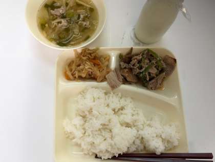 今日、6月11日の献立は、豚肉の梅風味焼き、すまし汁、切り干し大根の炒め煮です。豚肉は梅肉であっさりとした味付けでした。しゃききゃきしたピーマンと豚肉の風味がよくあっていました。すまし汁はかつおと昆布の出汁がきいていて、野菜がたくさん入っていて柔らかく、細かく切ったタケノコがアクセントになっていました。切り干し大根は大根を切って干したものですが、生のものより、うまみと栄養価が増えるそうです。食物繊維やカルシウム、鉄分がたっぷり入っているそうです。