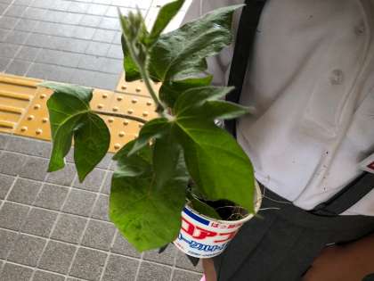 1年生が種をまいたアサガオが大きくなってきました。種をたくさんまいたので、間引きして、家に持って帰ることにしました。鉢には2.3本残しています。いよいよつるが伸びてきます。