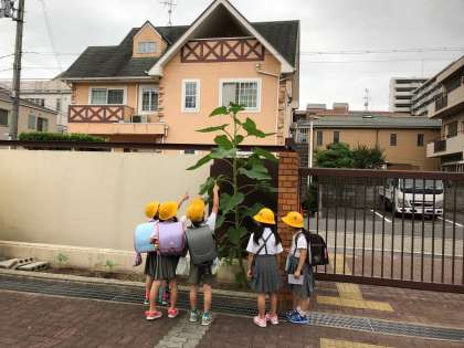 今日は下校途中の子どもたちがひまわりの花を発見。支柱も立てていないのにしっかりと立っています。