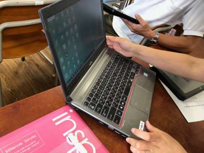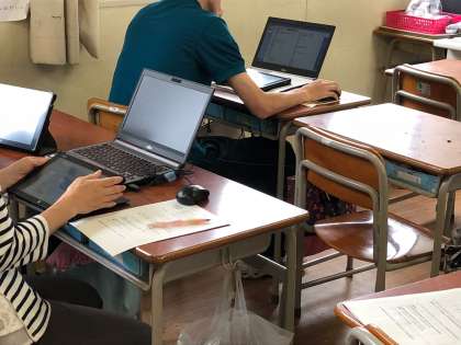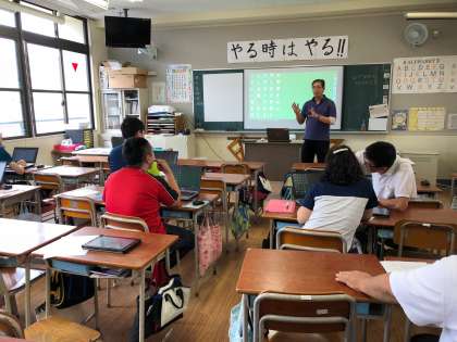放課後の教室では、先生達が集まってICTの研修をしています。授業用パソコンとタブレットを使って、授業でwebライブラリの活用の仕方が変わったので、使えるように研修を受けています。