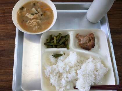 今日6月13日の献立は、鶏肉のしょうゆバター焼き、味噌汁、三度豆のからしじょうゆ和えでした。鶏肉は焼き物機でこんがり焼かれていて、バターの香りがしました。味噌汁は具たくさんで、昆布と鰹節の出汁がしみていました。三度豆はからしの風味があり、歯ごたえも合わせておいしかったです。三度豆は、一年に三度収穫できるので三度豆という名前で呼ばれているそうです。北海道から沖縄まで日本中で栽培されています。旬の時期は春から夏にかけてだそうです。