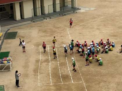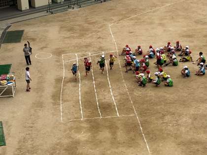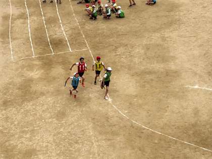 6年生がリレーの練習をしています。写真は下からスタート、上がバトンパスのところです。運動場では、『がんばれー』の声援が飛んでいました。