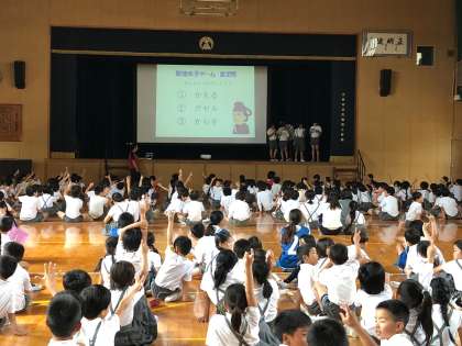 今朝の児童集会は、聖徳太子ゲームでした。同時に何人かで声を出して、なんと言ったかを当てるゲームです。聖徳太子はたくさんの人が同時に話してもすべて聞き分けたと伝説がありますが、子どもたちも結構当てていました。すごい!