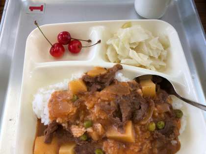 今日6月22日の給食の献立は、ハヤシライス、キャベツのゆずドレッシング、さくらんぼでした。ハヤシライスは柔らかく煮込まれた玉ねぎやジャガイモと手作りのルーがよくあっていて、子どもたちにも人気のメニューでした。キャベツはさわやかな風味と香り、歯ごたえが食欲をそそります。さくらんぼは今が旬の果物です。さくらんぼは一年に一回しか登場しない貴重なメニューです。