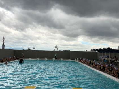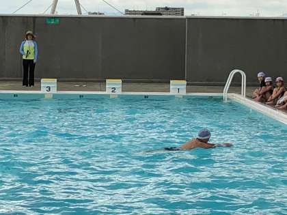 今日は曇っていますが、水温も気温も高く、3年生はプールで泳ぐ練習をしています。バタ足で体をしっかり伸ばして早く進むことができる人が見本を見せてくれました。みんな、頑張って!