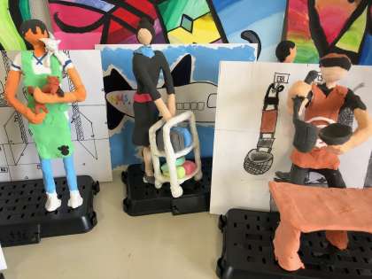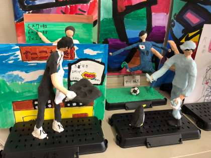 6年生の『12年後の私』という作品が完成に近づいてきました。将来なりたい職業について活躍している様子です。個性的な作品が仕上がりつつあります。