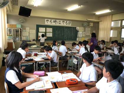 発表ボードを使って、グループで話し合ったことを前に貼っていきます。この後、代表の人が前に出て、発表します。みんなの考えを練り上げて、共有するのに効果的な方法です。