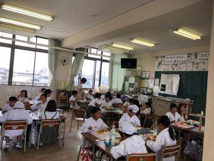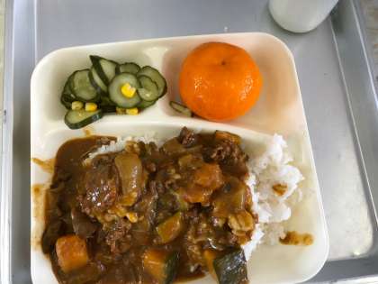今日の献立は、夏野菜のカレー、きゅうりとコーンのサラダ、冷凍みかんでした。カレーにはトマト、玉ねぎ、ナス、かぼちゃ、ピーマン、セロリなどが煮込まれていて、栄養たっぷり。サラダはさっぱりとした味つけでした。冷凍みかんは、教室で食べるころには、ちょうどよい具合になっていて、夏にぴったりの献立でした。