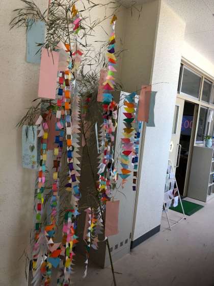 7月7日は過ぎてしまいましたが、一年生の教室前に、願い事を書いた短冊やん飾りがたくさんついた笹が置いてあります。願い事の中には、ケーキやさんになりたいとか、水泳が上手になりたいというかわいい願い事がたくさんありました。