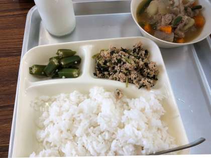 今日の献立は、豚肉とジャガイモの煮物、オクラの梅風味、ツナっぱいためでした。豚肉とジャガイモの煮物は、柔らかく煮込まれたジャガイモやニンジンのほかに、綱こんにゃくが入っていて、弾力のある歯ごたえがアクセントになっていました。ツナっぱいためはご飯によく合う味わいでした。オクラの梅風味がさっぱりとした味わいで、全体を引き締めてくれていました。