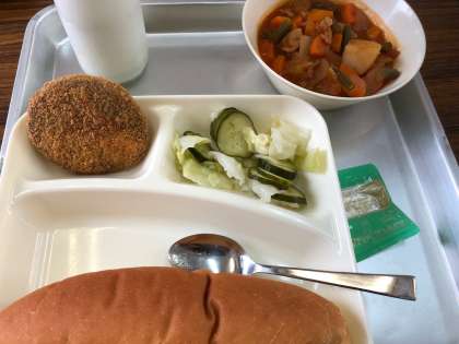 今日の献立は、チキンレバーカツ、ケチャップ煮、キャベツときゅうりのサラダでした。チキンレバーカツは、カレー味で子どもたちには大評判でした。ケチャップ煮にはたくさんの種類の野菜がしっかりと煮込まれています。キャベツときゅうりのサラダは酸味がきいていて、さっぱりとした味わいでした。レバーには脂肪が少なくタンパク質がたくさん含まれています。また、血を作る鉄もたくさん含まれているそうです。まさに子どもたちにはぴったりの献立でした。