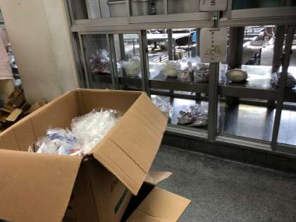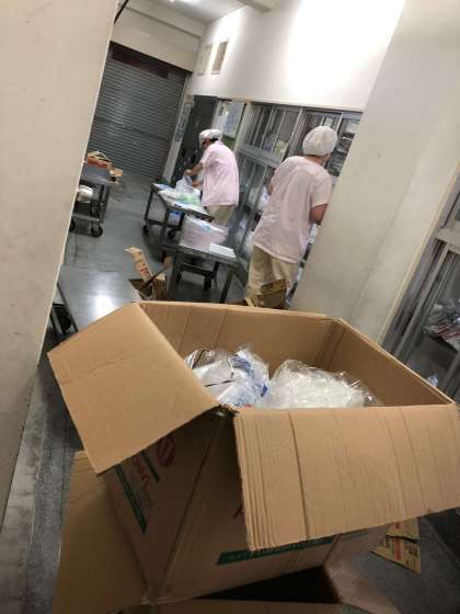 今日から3日間、工事のため給食室が使えません。給食室では、大きなダンボールを開けて、調理員さん達が準備の真っ最中です。