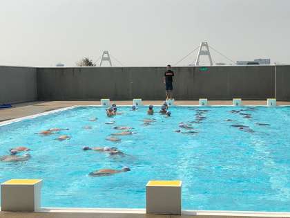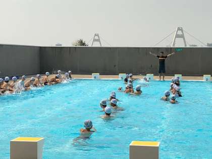 朝から気温と水温が高いですが、屋上プールは風があってさわやかです。絶好の水泳日和の中、5年生が元気に練習しています。