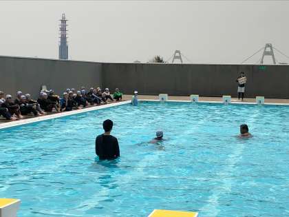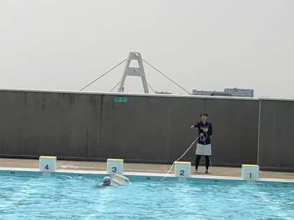 毎年6年生はこの時期に着衣水泳を実施しています。もしも服を着たまま、水の中に落ちたりしたとき、あわてずにどう動いたらいいのかを体験しています。写真はペットボトルをいくつかくくった浮きを使って、水の中の人を助ける方法を見ています。この後服を脱ぐのに一苦労していました。貴著な体験です。
