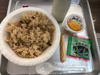 1学期最後の給食です。調理を伴わない給食の3日目の献立は、かやくご飯、ソフト黒豆、棒チーズ、みかんゼリー、牛乳でした。かやくご飯は学校では初めてのメニューで、子どもたちはどんなご飯が来るのか、楽しみにしていました。しっかり具が入っていて、味つけもあっさりと食べられました。