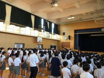 今日も朝から暑かったですが、終業式を迎えることができました。普段少し遅れて来る子どもたちも今朝は遅れることなくそろうことができました。夏休みを迎えるにあたり、周りの人たちへの感謝の気持ちを大事にしてほしいこと、マナーを守ることなどの話の後、元気に校歌を歌って終了しました。