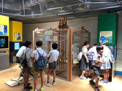 テラドームの中にあるいろいろなコーナーで、体験活動をしています。自然や天体などについて、学んでいます。