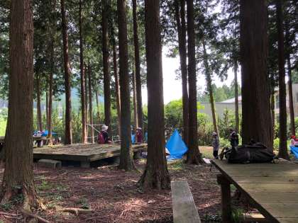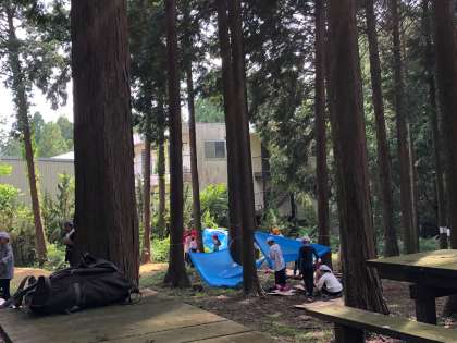 ゲームの後、シートやダンボール、ロープなどを使って秘密基地作りをしました。グループで協力してアイデアを出し合っています。さてどんな基地ができるでしょうか。